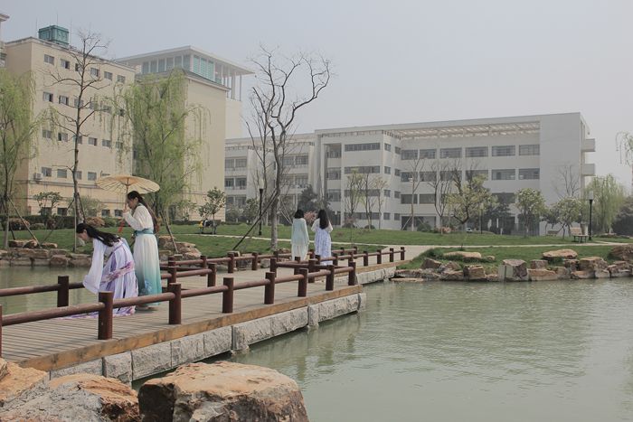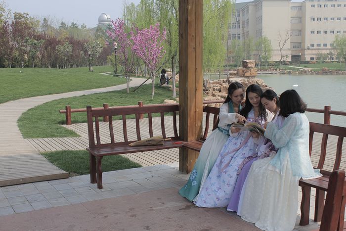 没错,那正是学校汉宣社的一群妙龄少女们,他们身着汉服,徜徉在初春的校园内,或歌或诗,或舞或静,用他们独有的方式诠释心底对汉文化的深情,同时,也给我们初春的校园增添了一份浓浓的古典文化韵味。
