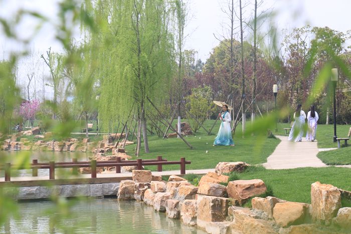 酒不醉人,人自醉。景不黏人,人黏景。曲径通幽的木板小道,三三两两的吸引了校园的学子前来踏春,而汉宣社的姑娘们却别出心裁,一袭素雅汉服,不必有丝竹管弦相伴,也能在这校园春光中忘我蹁跹起舞,春风掠过他们曼妙的身姿,让这份美妙融化在校园的春景之中。