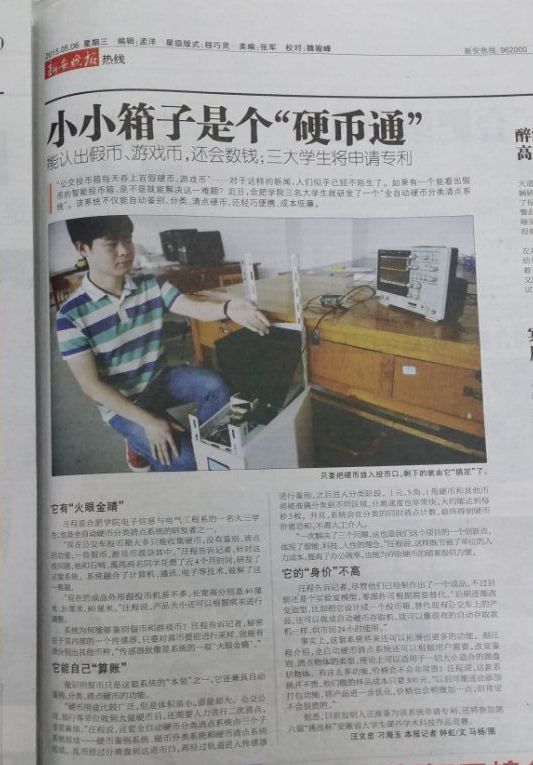 “现在公交车投币箱大多只能收集硬币,没有鉴别、清点的功能,一些假币、游戏币混杂其中。”汪程告诉记者,针对这些问题,他和石响、禹芮两名同学花费了近4个月时间,研发了这套系统。系统融合了计算机、通讯、电子等技术,破解了这一难题。