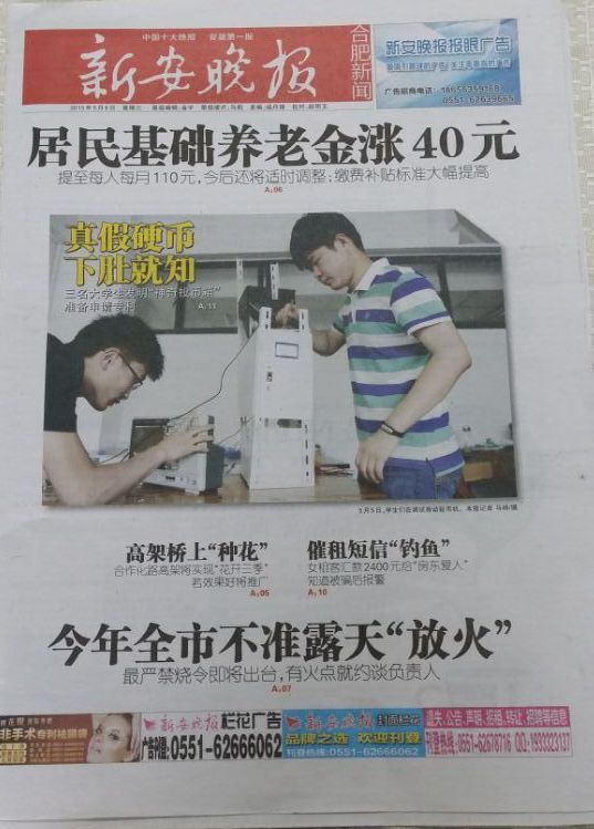 “公交投币箱每天吞上百假硬币、游戏币”……对于这样的新闻,人们似乎已经不陌生了。如果有一个能看出假币的智能投币箱,是不是就能解决这一难题?近日,合肥学院三名大学生就研发了一个“全自动硬币分类清点系统”。该系统不仅能自动鉴别、分类、清点硬币,还轻巧便携、成本低廉。