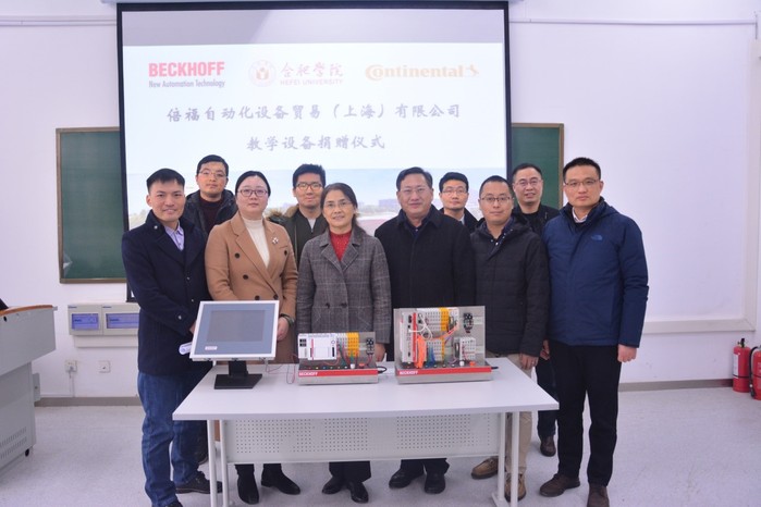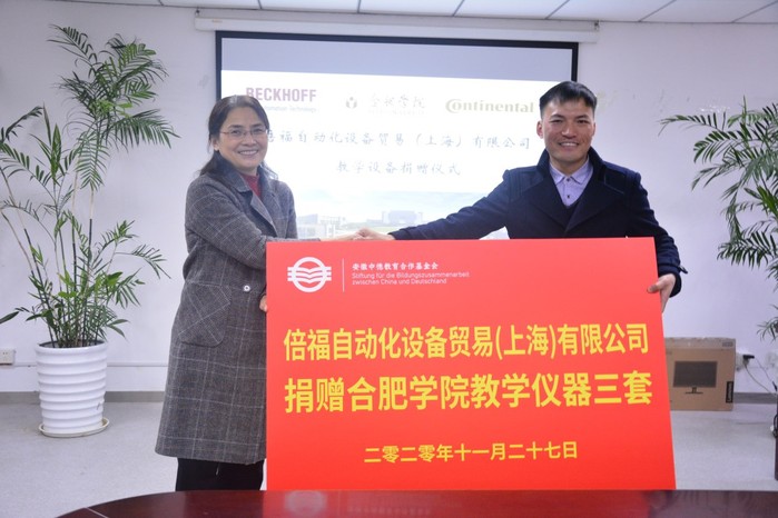 Am Nachmittag des 27. November fand die Spendenzeremonie für Lehrausrüstung der Beckhoff Automation Equipment Trading (Shanghai) Co., Ltd. im Besprechungsraum im Gebäude 40 unserer Universität statt. Chen Xiu, Vizepräsidentin der Universität Hefei und Vorsitzende des Stiftungsrats der Bildungskooperation zwischen China und Deutschland in Anhui (im Folgenden als Stiftung bezeichnet), nahm an der Spendenzeremonie teil. Zhang Hongbiao und Ge Changxiang, Vertreter von Beckhoff Automation Equipment Trading (Shanghai) Co., Ltd., Wang Xin, Vertreter der Continental Co., Ltd, He Shikun, Direktor der Finanzabteilung der Universität Hefei und Generalsekretär der Stiftung, und Liu Jinping, Direktor des Verwaltungsbüros der Stiftung, nahmen an der Spendenzeremonie teil. Die Zeremonie wurde von Lv Gang, Direktor des Instituts für Manufaktur und Bauwesen, geleitet.