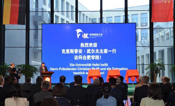 Am 26.05.2018 besuchte Christian Wulff, der ehemalige Bundespräsident sowie Präsident von Global Alliance of SMEs, die Universität Hefei, der sich auch an der Eröffnungszeremonie des German Industry 4.0 (Hefei) Cooperation Promotion Centers, Global Network of Business Organization (Hefei) Bases sowie chinesisch-deutschen Zentrums für Kollaborative Innovation in der Forschung von festen Abfällen, beteiligte. Das Team von Christian Wulff, Vertreter von Global Alliance of SMEs, Vertreter von der Universität Stuttgart, Prof. Dr. Cai Jingmin, Parteisekretär der Universität Hefei sowie Wang Qidong, Vizeparteisekretär sowie Direktor der Universität Hefei nahmen daran teil.